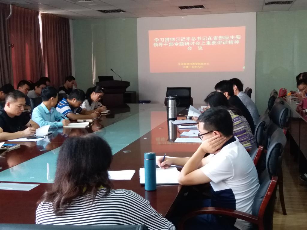 9月12日下午,我院党总支按照《中共yl6809永利集团委员会关于深入学习贯彻习近平总书记在省部级主要领导干部专题研讨班上重要讲话精神的通知》要求,在五楼会议室召开总支扩大会议组织全体教工学习,生命科学技术学院、生物技术研究所、能源研究所全体教师参加此次了会议。会议由党总支书记田涛主持。