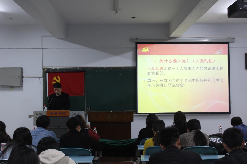 为让同学们对党有深刻的了解,充分做好入党准备。我院于11月6日晚上7点在A03-414开展以“坚定理想信念,做社会主义合格建设者和可靠接班人”为主题的入党培训课程。我院党总支书记田涛为此次主讲人,各年级辅导员及部分党员教师、第二十三期入党积极分子参加本次课程。