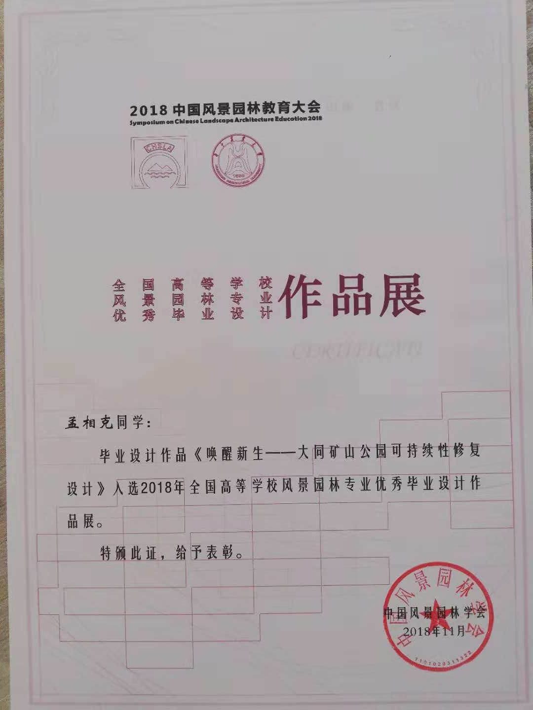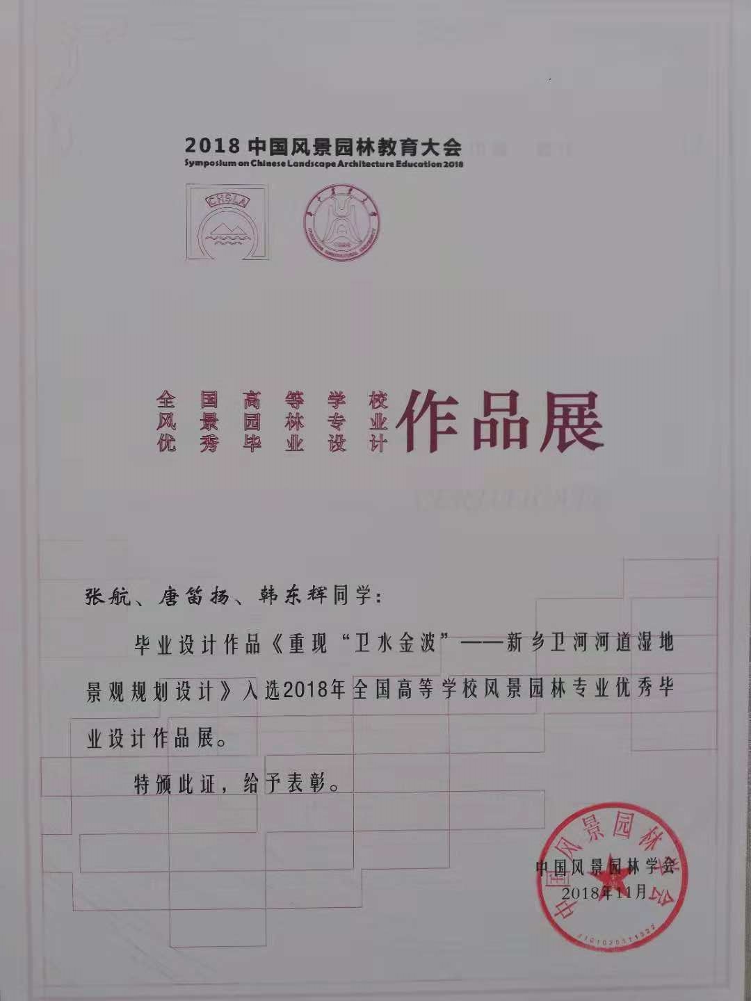 本次展览共汇集了来自全国54所高校的160件优秀毕业作品,此次展览涉及“遗产保护”“规划设计”“生态修复”“生境营造”等多个方面。由我校郭晖、张家洋、靳筠老师指导,园林专业张航等同学的《重现“卫水金波”一一新乡卫河河道湿景观规划设计》、孟向克等同学的《唤醒新生一一大同矿山公国可持续性修复设计》作品人选2018年全国高等学校园林专业优秀毕业设计作品展,这是我校园林专业学生作品首次参加全国作品展。两幅作品以景观园林设计师的角度再现过去人们对自然的爱与敬重,用生态恢复的手段,让新乡、大同记忆中的自然景观重现,并使环境得到良性循环的发展。通过未来与过去的起落对比,使人们意识到当人类善待自然时,自然也会对人类进行回馈和报答。作品展示了同学们的艺术思考、人文关注、醇美情怀、精神追索和文化期望,凝聚了我校园林学生创造持续美好生活的理想与智慧。