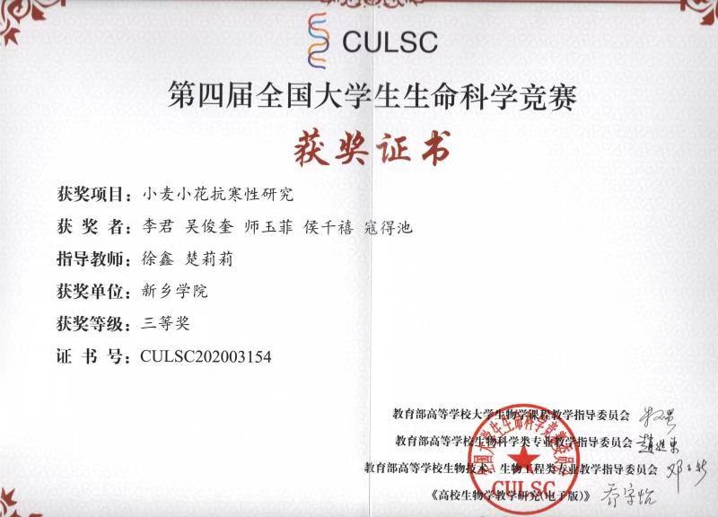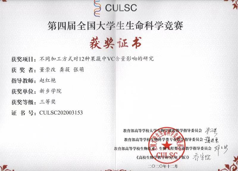 为培养大学生的创新意识、实践能力和团队精神,拓宽科学视野,增强社会责任感,促进生命科学学科教学改革,提高人才培养质量,由教育部高等学校大学生物学课程教学指导委员会、教育部高等学校生物科学类专业教学指导委员会、教育部高等学校生物技术与生物工程类专业教学指导委员会举办的第四届全国大学生生命科学竞赛暨第三届河南省大学生生命科学竞赛决赛于2020年11月14日上午在河南城建学院举行。经过近一年的实验准备和材料上传,经过网络评审我院共有7支队伍进入决赛,决赛采取线上答辩的形式进行,经过现场的激烈角逐,我院徐鑫老师指导的项目《小麦小花抗寒性研究》、赵红艳老师指导的项目《不同加工方式对12种果蔬中VC含量影响的研究》获得国家级三等奖和河南省二等奖,许飞老师指导的项目《杨树树干非结构性碳水化合物的空间变异》、崔婧老师指导的项目《2种速生阔叶杨树非结构性碳水化合物的分配》、张万方老师指导的项目《核酸适配体生物传感器对肉蛋类制品中氨苄青霉素残留的研究》、王利平老师指导的项目《牦牛SLC11A1基因结构变异分析》、何金娇老师指导的项目《3种兽用消毒剂对金黄色葡萄球菌的杀菌效果研究》分别获得河南省三等奖。
