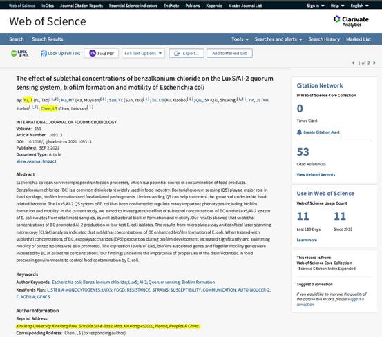 近日,我院于涛副教授课题组在细菌LuxS/AI-2群体感应系统对消毒剂的响应机制方面取得新进展,相关成果“The effect of sublethal concentrations of benzalkonium chloride on theLuxS/AI-2 quorum sensing system, biofilm formation and motility ofEscherichia coli”以研究论文形式发表于International Journal of Food Microbiology(农林科学1区,IF=5.277)。