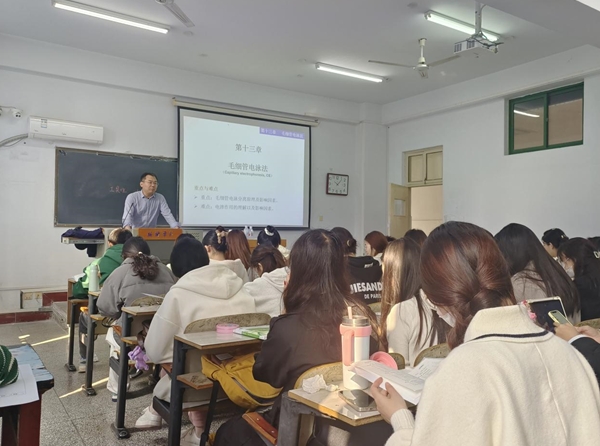 在授课过程中,田金河老师运用丰富的教学手段和方法,详细讲解了毛细管电泳分离原理及影响因素。在整个教学过程中,田金河老师教学思路清晰,教学内容重难点突出,在授课过程中积极引导学生讨论,启发学生思考,充分体现出了学生的主体和教师的主导作用。课堂上,学生精神状态饱满,课堂气氛活跃,取得了良好的教学效果。课后,各位听课教师就教学内容、教学方法和师生互动等方面与田金河老师进行了深入的交流与探讨。