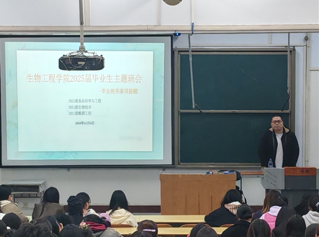 为保障明年毕业生顺利完成学业,全面了解毕业前后各项事宜,做好相关工作部署,11月4日下午,yl6809永利集团在A01-224召开2025届毕业生“跨越毕业间隙,展望未来之路”主题班会。会议由2021级辅导员宋博主持,2021级食品科学与工程1班、2021级生物技术1班、2021级酿酒工程1班全体学生参加了会议。