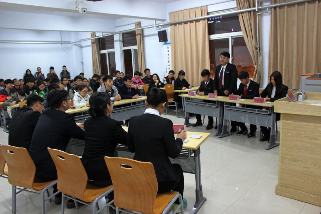 为了丰富大家的课余生活,增进同学之间的友谊,提高学生们的表达能力,我院举办了新生辩论赛。11月18日晚,辩论赛决赛在A14-601圆满结束。此次辩论赛由申琳琳主持,我院学生会主席刘帅,副主席李文明,团总支副书记商思露等学生会成员到场作评委。