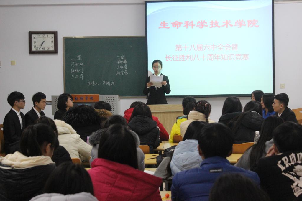 为贯彻学习十八届六中全会精神、纪念长征胜利八十周年,12月21日晚,我院在A14-601举行了以十八届六中全会暨长征胜利八十周年为主题的知识竞赛,我院两支代表队参与此次比赛,学生会主席团及各部部长担任评委。