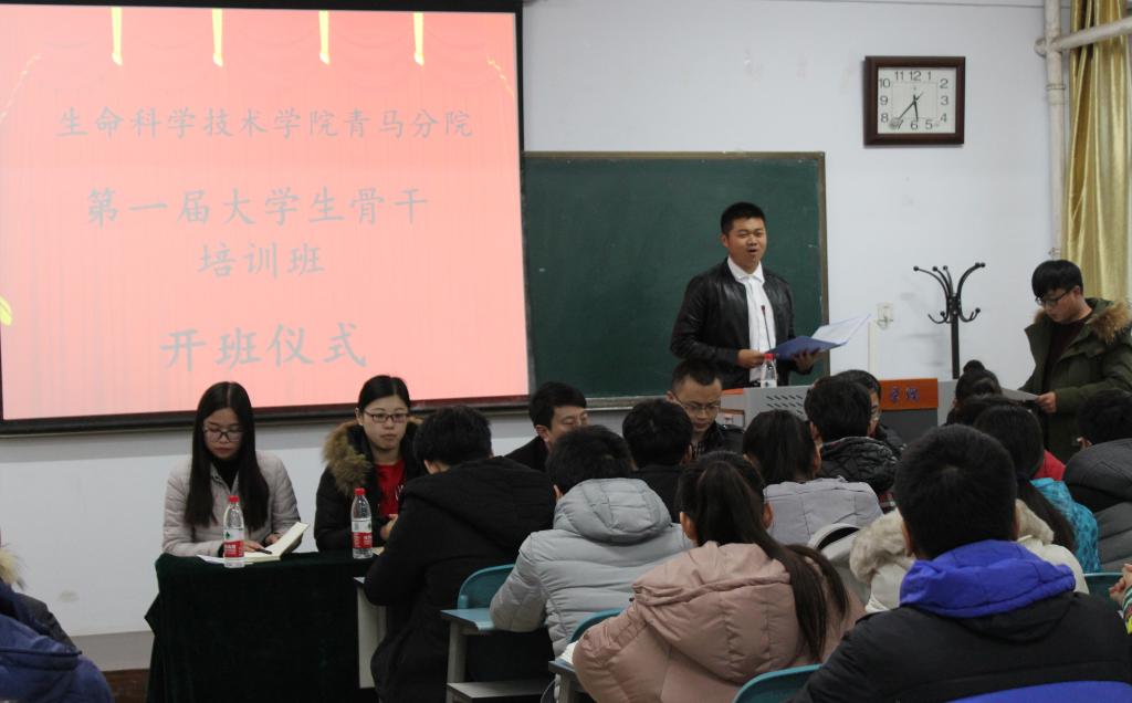 在主持人宣布会场纪律后,全体起立,奏唱《中华人民共和国国歌》,我院青年马克思主义培养学院第一期大学生骨干培训班开班仪式正式开始。首先,文文书记宣读了《生命科学技术学院青年马克思主义者培养学院培养方案》,然后学员代表李懿鹏上台进行发言,最后由田涛书记发表总结讲话。田书记强调作为学生干部,一定要加强学习,争做学习型的好干部。