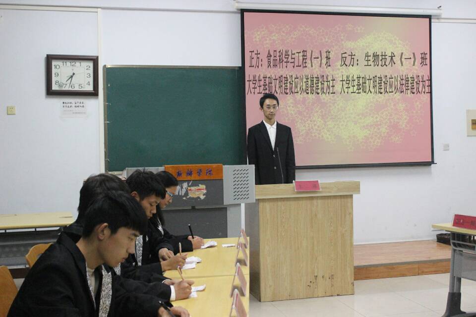 为活跃校园文化,普及辩论赛相关知识,我院新生辩论赛经过层层选拔,决赛于11月14日下午七点举行。此次比赛由食品科学与工程1班王博渊主持,我院学生会各部长担任评委。