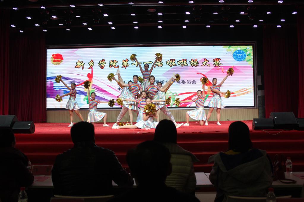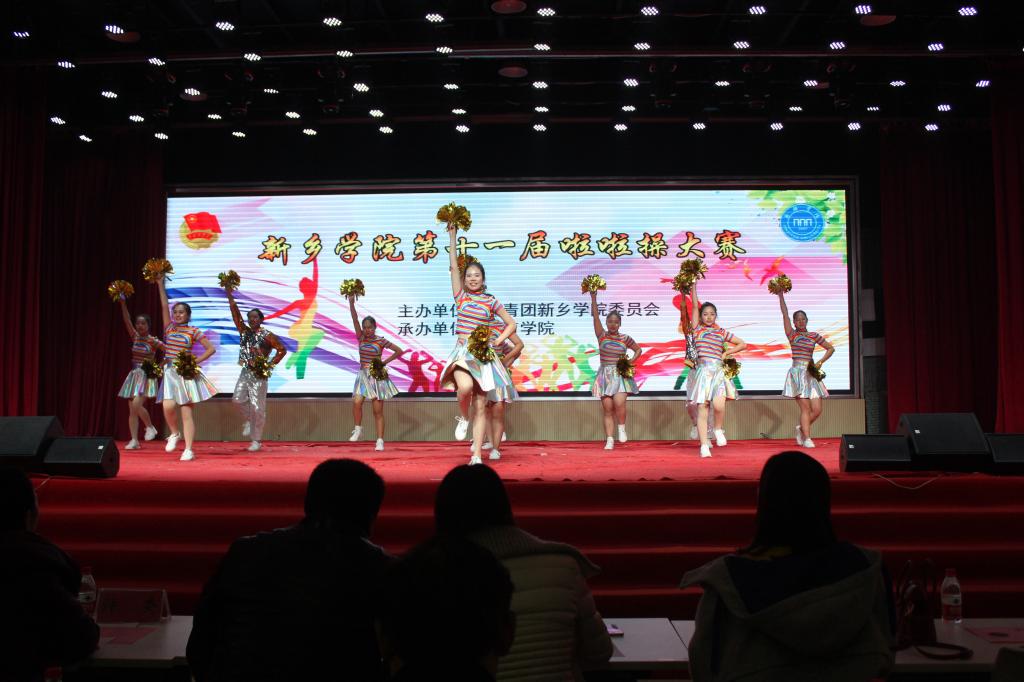 比赛开始之前,啦啦操队队员在侯场区等待,他们仍然在进行紧张的排练。比赛伊始,主持人介绍莅临此次比赛的学校领导老师及评委,并宣读比赛规则。随后,主持人宣布第十一届啦啦操大赛正式开始。各学院啦啦操代表队都将他们的努力成果展现在舞台上。我院啦啦操队第三位上场,他们手执金色花球,舞步整齐,动作铿锵有力,伴着音乐舞动身体。随着音乐的切换,队员们在动感的节奏中挥舞手臂,不时变化动作和队形,用身姿诠释着青春的奔放,用热情编织着青春的浪漫,舞力青春,魅力无限,而独特的造型展示了力与美的结合,带给大家一场视觉的盛宴。经过十八个院系啦啦操代表队的精彩比拼,最终,我院以9.08分的成绩获得了此次比赛的二等奖。