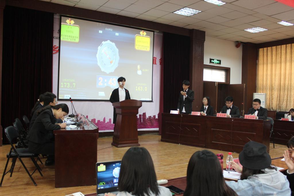 辩论赛分为开篇立论、双方攻辩、自由辩论、评委点评和现场投票等多个环节。首先,主持人详细的介绍了辩论赛的规则和流程并宣布辩论赛开始。接着,我院与管理学院代表队开始围绕“共享单车的发展更应该注重管理升级还是产品升级”进行辩论。此次辩题新颖独特,双方辩手机智应答,辩论过程也是精彩激烈。在辩论之后,评委们对选手的表现给予了肯定和鼓励,同时也提出了要求和改进方法。最后评委和现场观众参与投票,成绩当场公布,我院代表队以微弱劣势不幸落败。