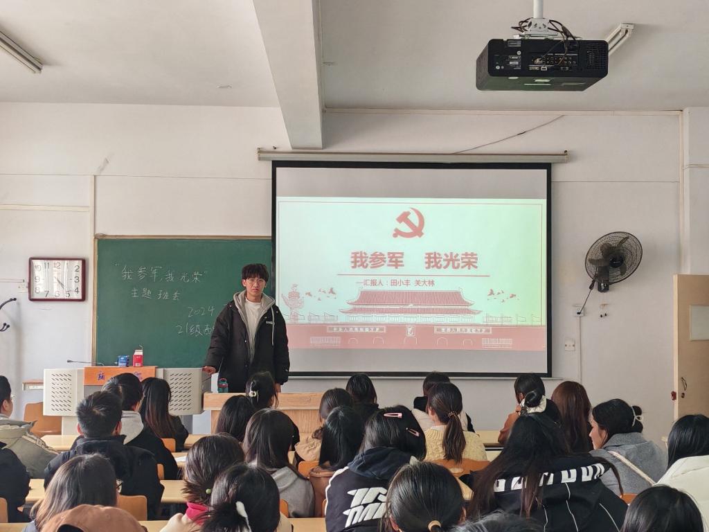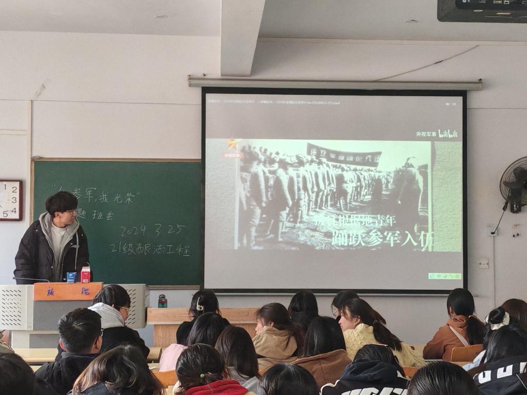 国无防不立,民无防不安,为增强广大青年学子的国防意识,建立良好的国防素质,深化爱国主义思想,营造爱国拥军良好氛围,进一步提高同学们对征兵政策的了解,鼓励广大同学积极参与征兵入伍,yl6809永利集团2021级酿酒工程1班于3月25日下午在A03-315召开2023-2024学年春季学期“我参军,我光荣”征兵动员主题班会,班会由2021级辅导员宋博指导,测评委员田小丰主持,关大林协助。