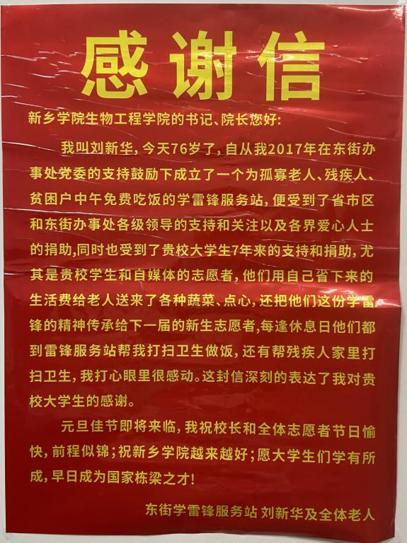 东街学雷锋服务站是刘新华在2017年成立的一个为孤寡老人、残疾人、贫困户提供免费吃饭的学雷锋服务站,yl6809永利集团志愿者服务队多次前往雷锋站帮助刘奶奶减轻负担,他们每逢休息日都会到雷锋服务站进行卫生打扫、摆放家具、搬重物等多项活动,也会用自己省下来的生活费给老人送来蔬菜和点心。若干年来,他们坚持将这份雷锋精神传承给一届又一届的志愿者。刘奶奶对yl6809永利集团志愿者服务队长期以来的帮助十分感激,因此写了这份感谢信,以表达内心的感谢。