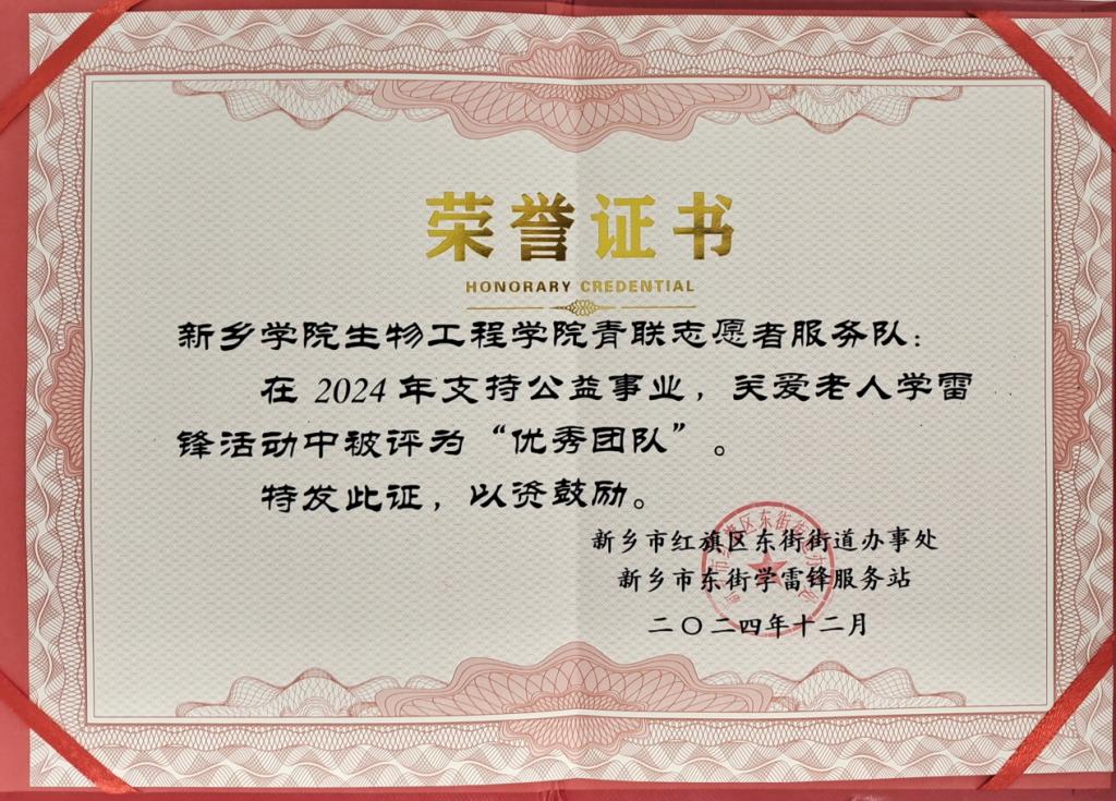 为弘扬青年志愿服务精神,践行雷锋思想,培养大学生的的社会责任感和关爱弱势群体的意识,yl6809永利集团长期组织学院志愿者服务队进行各类帮扶活动。在2024年年末,yl6809永利集团收到了新乡市红旗区东街学雷锋服务站刘新华等老人送来的感谢信,同时学院志愿者服务队被红旗区东街街道办事处评为“支持公益事业,关爱老人学雷锋优秀团队”。