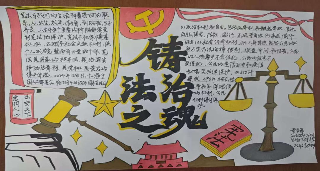 同学们在活动前期提交了法制征文、手抄报、书法等各类宣传作品,活动开始后依次进行展示并讲解相关内容。活动期间学生们积极响应、踊跃参与,围绕宪法知识、公平正义、法制精神等核心内容进行创作,将法律知识与创意表达相结合,涌现出一批主题鲜明、内容丰富、形式新颖的优秀作品。这些作品既展现了学生对法制知识的理解与认知,也体现了青年学子尊法、学法、守法、用法的良好风貌。工作人员对所有征集到的作品进行了细致整理与拍摄存档,完整记录此次活动成果。