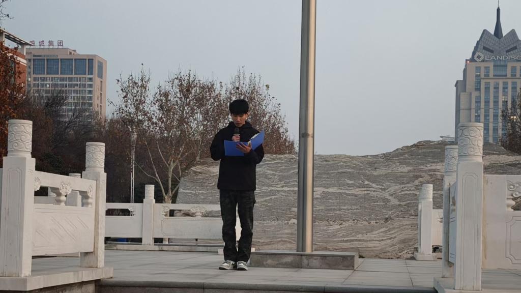 清晨天蒙蒙亮,同学们有序入场,仪式正式拉开帷幕。本次仪式流程严谨、环环相扣,共分为六项。第一项,国旗护卫队出旗。国旗护卫队队员身姿挺拔、眼神坚定,步伐整齐划一、铿锵有力,全体同学肃立,目光紧紧追随,向国旗致以最崇高的敬意。第二项,升国旗,奏唱国歌。激昂雄壮的国歌奏响,五星红旗在晨风中缓缓升起,全体同学面向国旗,行注目礼。第三项,国旗下讲话。学生代表王盼盼以饱满的热情发表演讲。他号召同学们将个人的热爱与理想,紧密融入国家发展的宏伟大局之中;把青春的热血与激情,毫无保留地汇入时代的滚滚洪流,在实现中华民族伟大复兴的征程中书写属于自己的精彩篇章。第四项,第16届国旗护卫队代表赵子皓发言。他以“一二·九”运动为切入点,深刻阐述了爱国精神的内涵与意义。他呼吁大家,不能仅仅将爱国停留在口号层面,而要将其转化为日常生活中的实际行动。要以先辈们为榜样,勇挑时代赋予的使命,在各自的岗位上发光发热。第五项,全体宣誓。在主持人的带领下,全体同学举起右拳,庄严宣誓。铮铮誓言如洪钟般响彻校园上空,彰显着青年学子们勇担责任、奋发有为的坚定决心和使命担当。第六项,主持人宣布升旗仪式圆满结束。