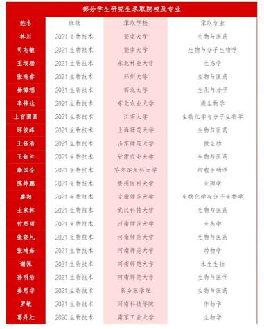 生物技术硕士研究生考取率逐年提升,近年来年均考研率40.1%,录取院校有南开大学、西北大学、暨南大学、江南大学、上海大学、郑州大学、华中农业大学、南京农业大学、陕西师范大学、华南农业大学、东北师范大学等双一流大学,部分同学硕博连读。