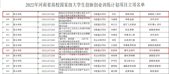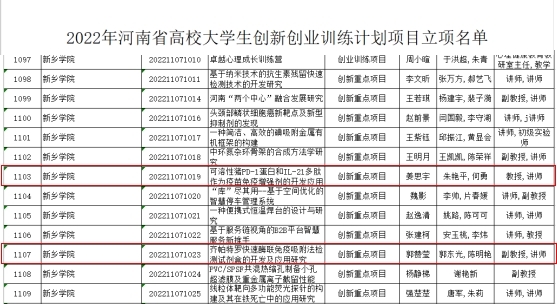 近日,2022年河南省高校大学生创新创业训练计划项目名单公布,我院共4个项目获批,其中2项国家级立项,分别为杜杭等人申报的《新型生态浮岛技术对豫北地区乡村河道水质净化修复效果的研究》(指导教师:郭晖、周慧)、陈恩希等人申报的《黄河湿地底质营养盐的吸附-释放动力学机制及生态修复模式研究》(指导教师:蔺芳、张艳芳)。另外2项获批省级立项,分别为姜思宇等人申报的《可溶性猪PD-1蛋白和IL-21多肽作为疫苗免疫增强剂的开发应用》(指导教师:朱艳平、何勇)、郭赞莹等人申报的《齐帕特罗快速酶联免疫吸附法检测试剂盒的开发及应用研究》(指导教师:郭东光、陈明艳)。