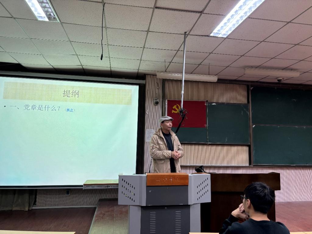 党课以“潜心党章研读,加强党性修养”为主题。康国政首先带领学生们正确认识中国共产党党徽、党旗。然后以党章为依托,从党章的概念出发,循循善诱的给学生们讲解党章与党史、党建的关系,强调了党章是党史和党建的统一体。接着,他开始向学生们讲述入党条件及程序,并介绍了一系列中国共产党优秀党员供学生们学习,引用了毛泽东对洪水性格的评价,让同学们对优秀党员有了更深刻的认识。随着课程接近尾声,康国政介绍了党的性质与指导思想并着重强调了党的理想与宗旨。伴随着学生们热烈的掌声,此次党课结束。